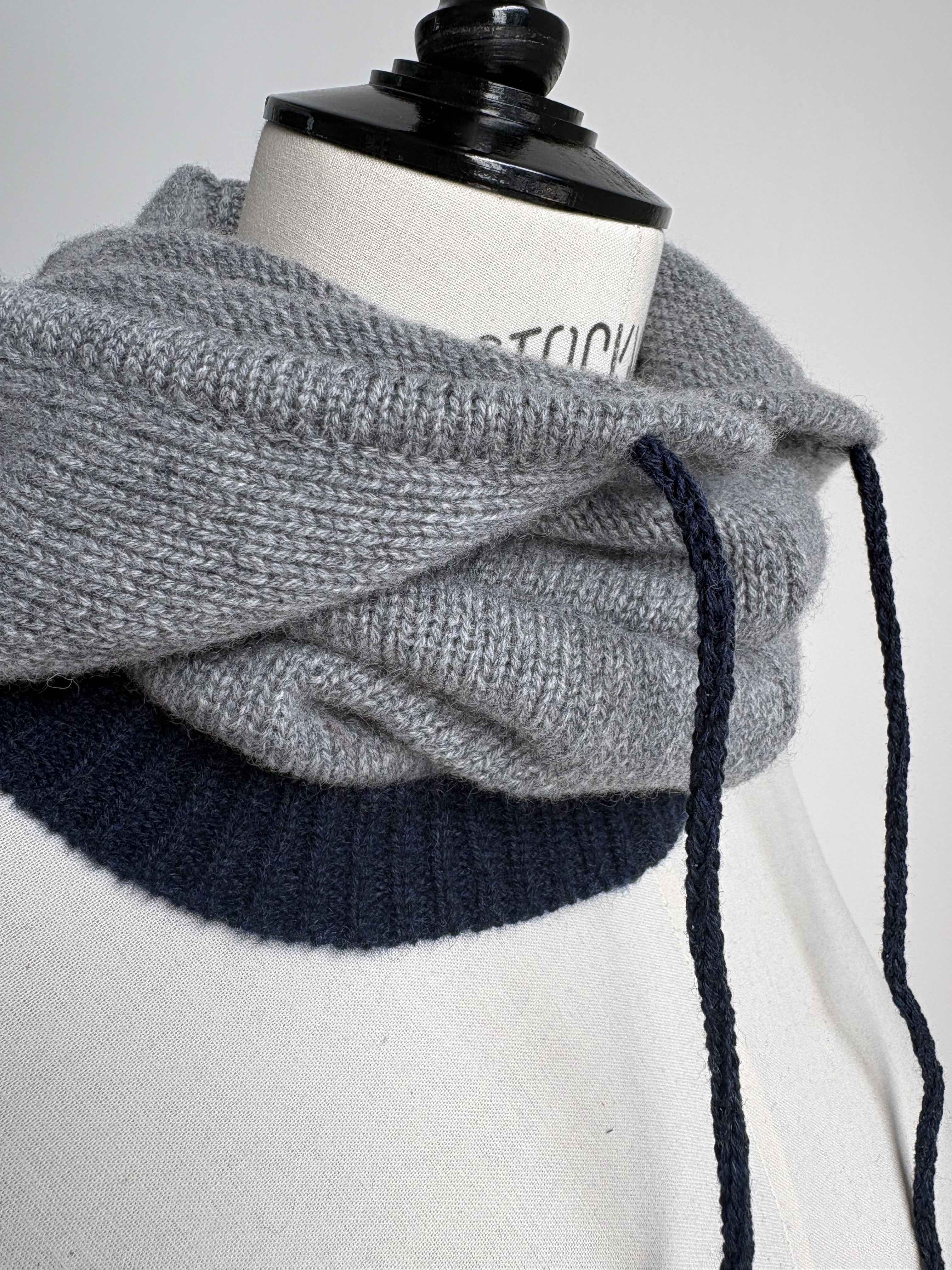 Grande capuche en pur cachemire 6 fils, qui peut se resserrer autour du visage grâce à son cordon – La base du cou est haute pour protéger amplement le cou à la façon d’un tour de cou – Le modèle est bicolore avec un bord côte sur 3 cm et le cordon coordonné en ton.