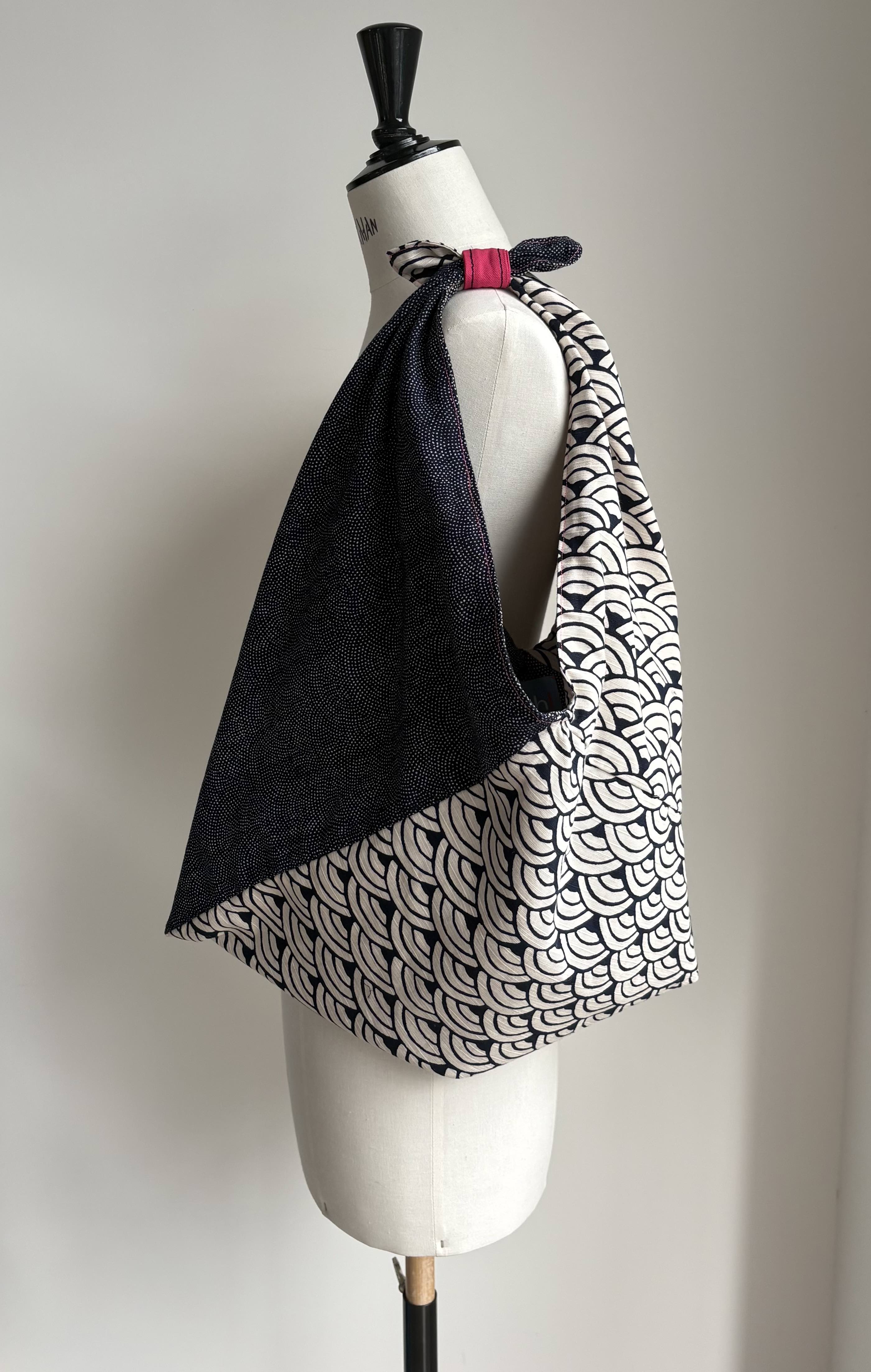 Sac origami réversible coton japonais motifs vague indigo / blanc
